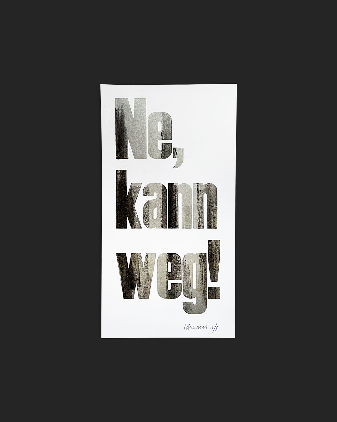 Handgesetzter Hochdruck in limitierter Auflage von fünf Exemplaren. Gedruckt auf 150-g/m²-Papier (Metapaper) im Format 16×30 cm. Jedes Exemplar ist nummeriert und signiert.